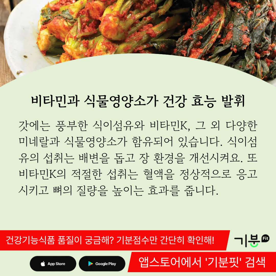 갓에는 그 외에도 풍부한 식이섬유와 비타민K, 그 외 다양한 미네랄과 식물영양소가 함유되어있다.