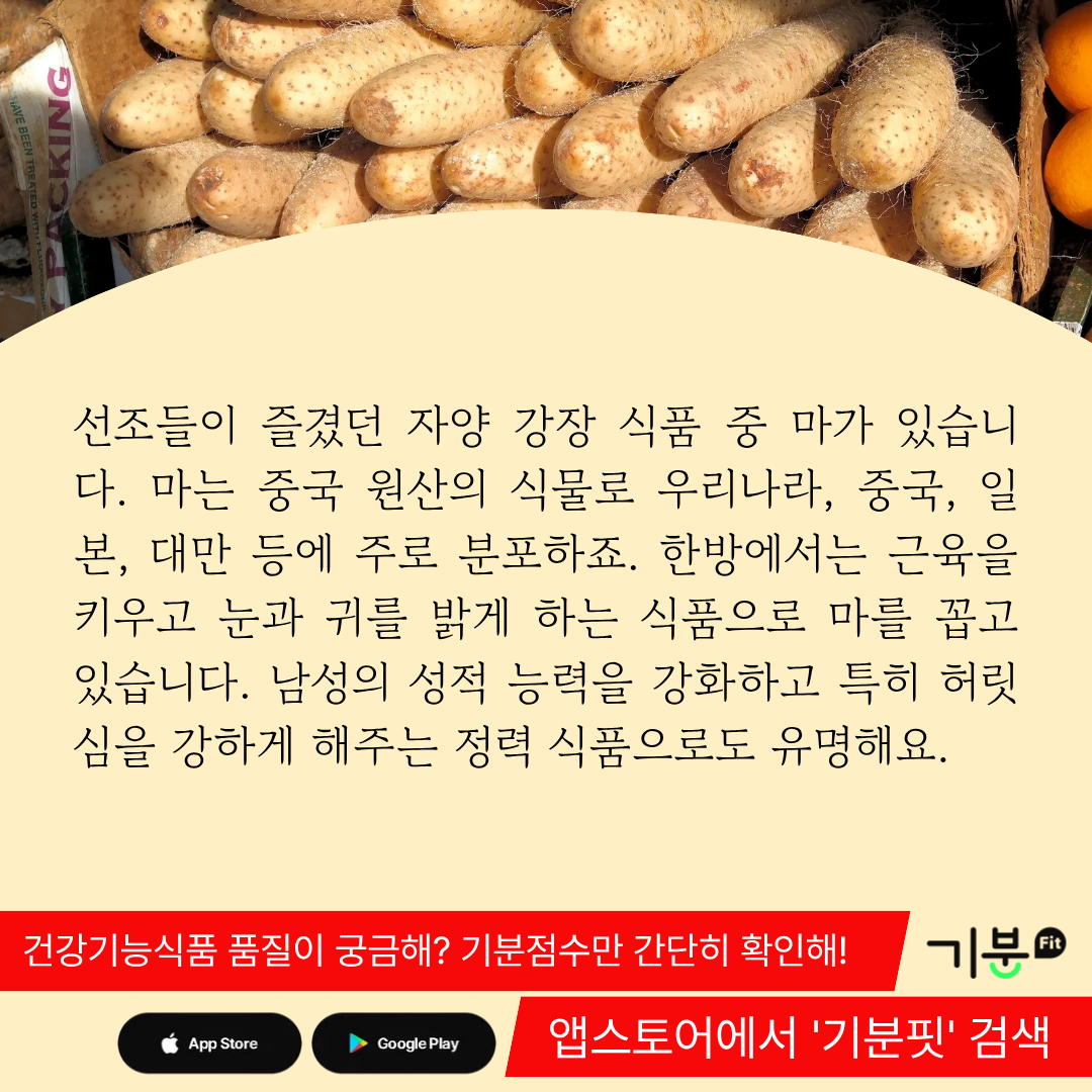 한방에서는 근육을 키우고 눈과 귀를 밝게 하는 식품으로 마를 꼽고 있다.