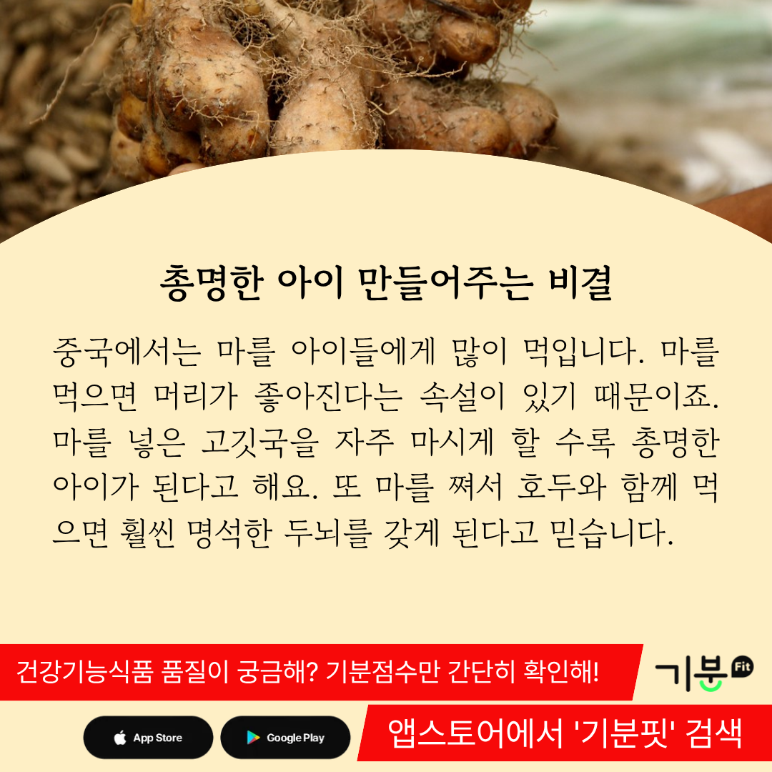 마를 넣은 고깃국을 자주 마시게 하면 총명한 아이로 만들 수 있다는 속설이 있다.