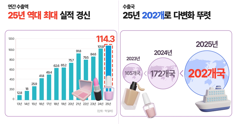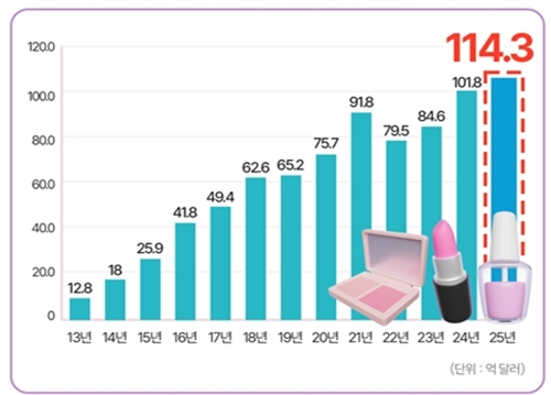 식품의약품안전처는 9일, 지난해 국내 화장품 수출액이 전년 대비 12.3% 증가한 114억3100만 달러로 잠정집계됐다고 밝혔다. 2023년 84억6000만 달러, 2024년 101억8000만 달러에 이어 3년 연속 최고 기록을 경신했다.