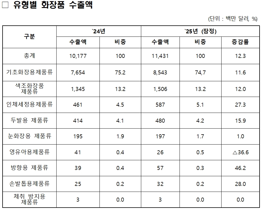 제품 유형별로는 기초화장품 수출이 85억4300만 달러(+11.6%)로 전체의 74.7%를 차지했다. 색조화장품은 15억600만 달러(+12.0%)로 비중 13.2%를 유지했다. 인체세정용 제품은 4억6100만 달러에서 5억8700만 달러(+27.3%)로, 두발용 제품은 4억1400만 달러에서 4억8000만 달러(+15.9%)로 늘었다.