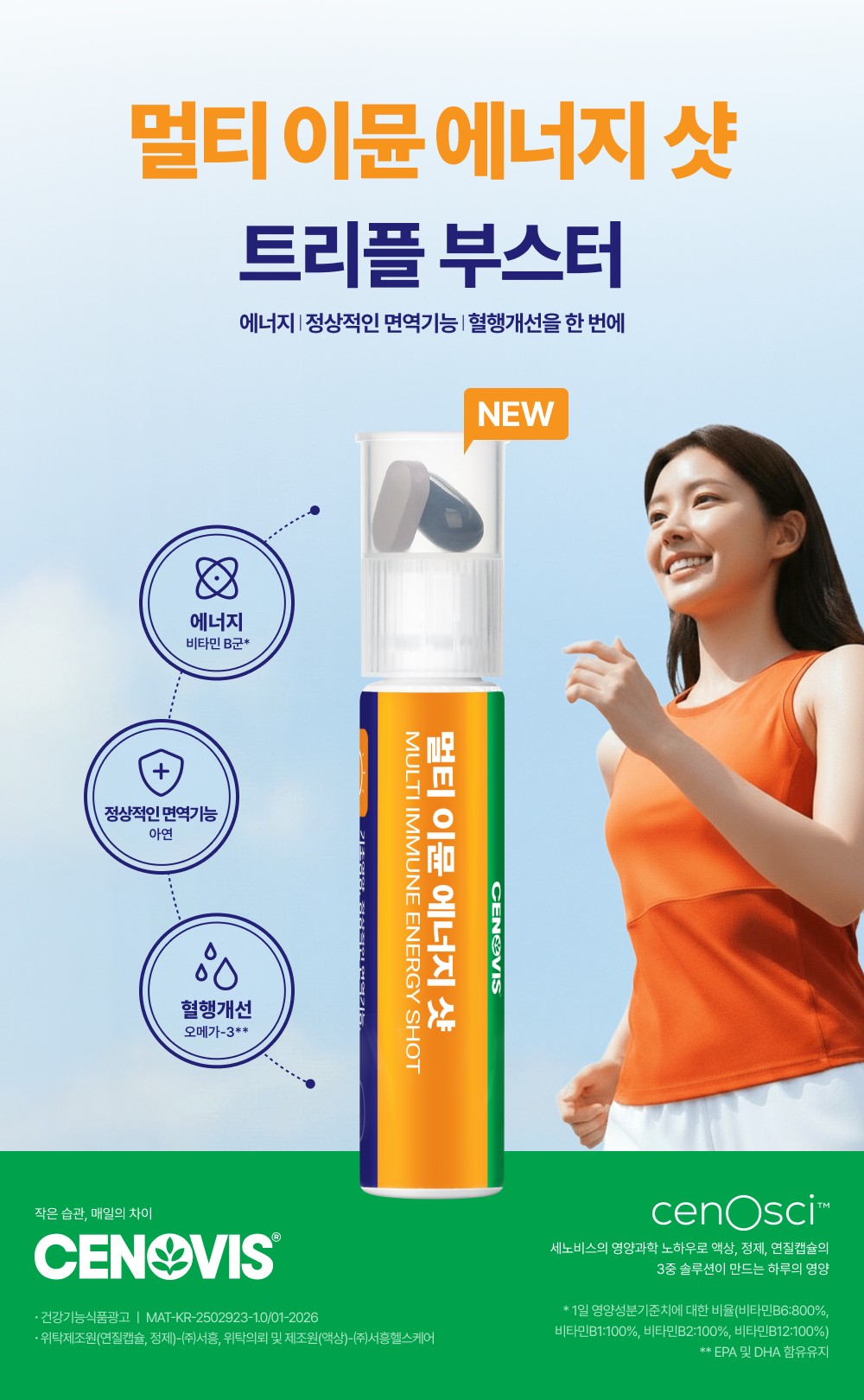 멀티 이뮨 에너지샷은 전문성과 기술력에 기반한 세노비스 만의 과학적 맞춤 영양 설계 원칙인 세노사이(CenoSci)를 바탕으로, 현대인의 일상에 맞춘 간편한 섭취를 위해 개발됐다. 특히 국내에서 오랜 기간 신뢰를 받아온 스테디셀러 ‘트리플러스’의 영양 설계 노하우를 토대로 최신 트렌드에 부합하는 3중 제형으로 구현한 점이 특징이다.