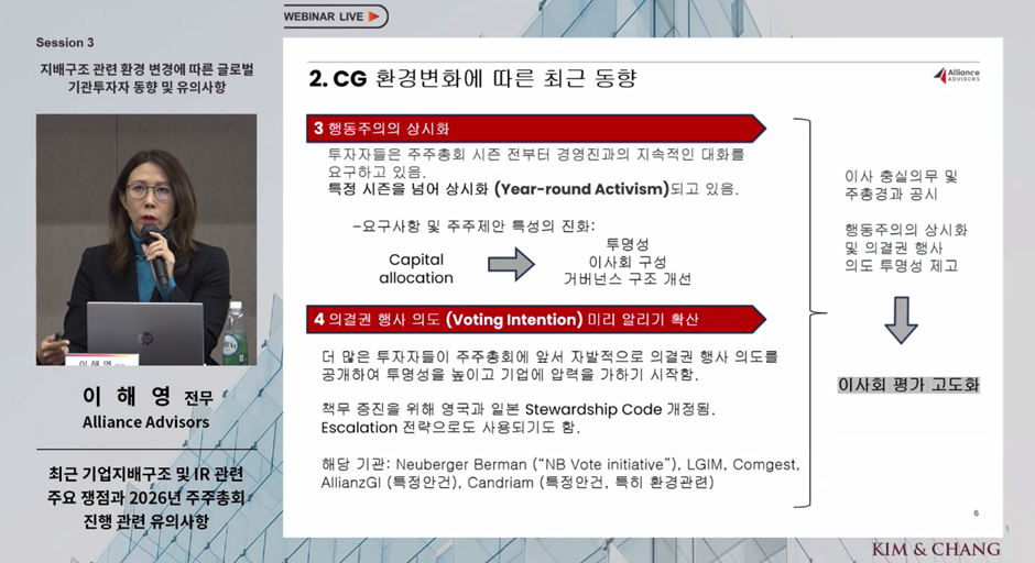 얼라이언스 어드바이저스 이해영 전무는 국내외 지배구조 환경 변화에 따른 최근 동향과 함께, 상장사가 유의해야 할 주요 이슈와 주주총회 대응 전략을 발표했다.