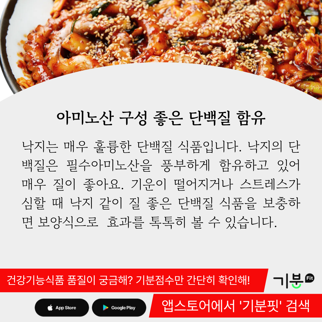 낙지의 단백질은 필수아미노산을 풍부하게 함유하고 있어 매우 질이 좋다.