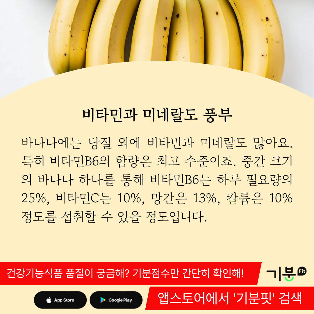 중간 크기의 바나나 하나를 통해 비타민B6는 하루 필요량의 25%, 비타민C는 10%, 망간은 13%, 칼륨은 10% 정도를 섭취할 수 있을 정도다.