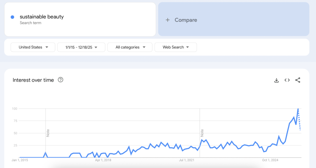 지난 10년간 미국에서 지속적으로 증가하고 있는 '지속 가능한 뷰티' 검색 구글 트렌드. ⓒPBA