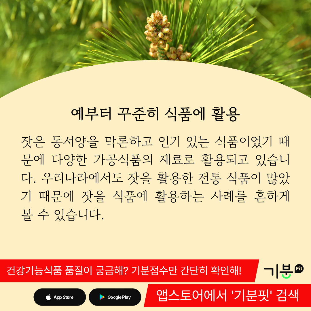 잣은 동서양을 막론하고 인기 있는 식품이었기 때문에 다양한 가공식품의 재료로 활용되고 있다.