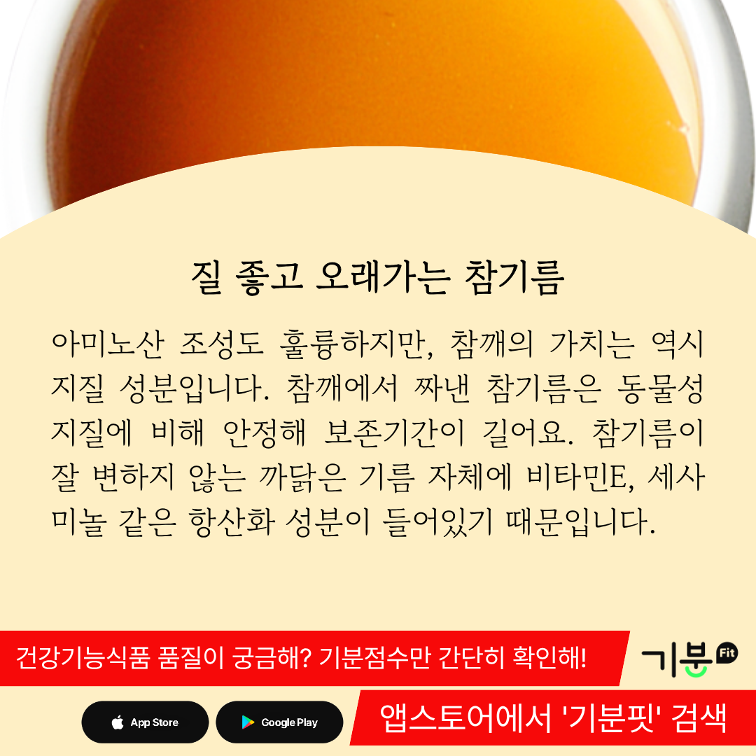 참기름이 잘 변하지 않는 까닭은 기름 자체에 비타민E가 풍부하고 세사미놀 같은 항산화 성분이 들어있기 때문이다.