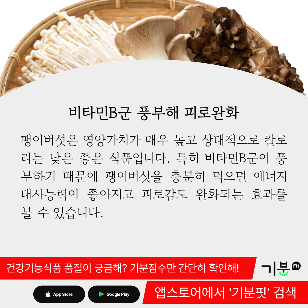 비타민B군이 풍부하기 때문에 팽이버섯을 충분히 먹으면 에너지 대사능력이 좋아지고 피로감도 완화되는 효과가 있다.