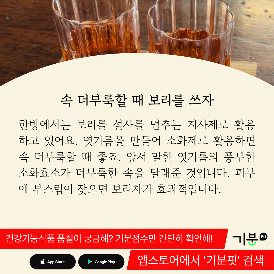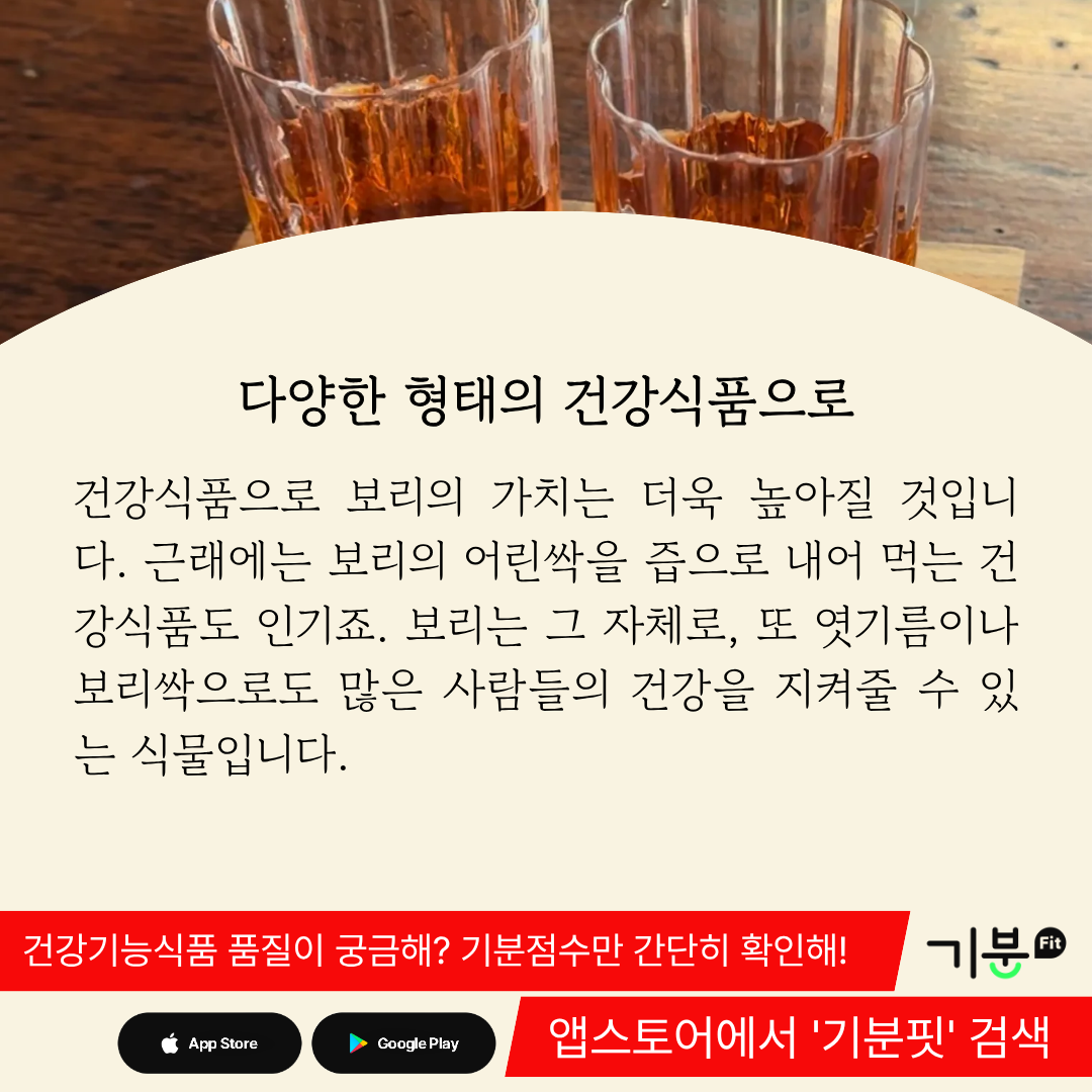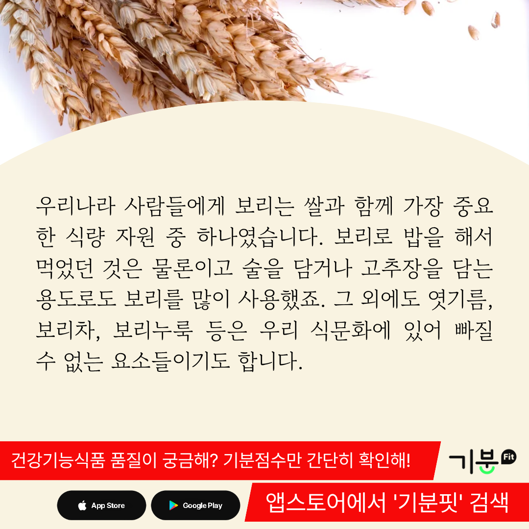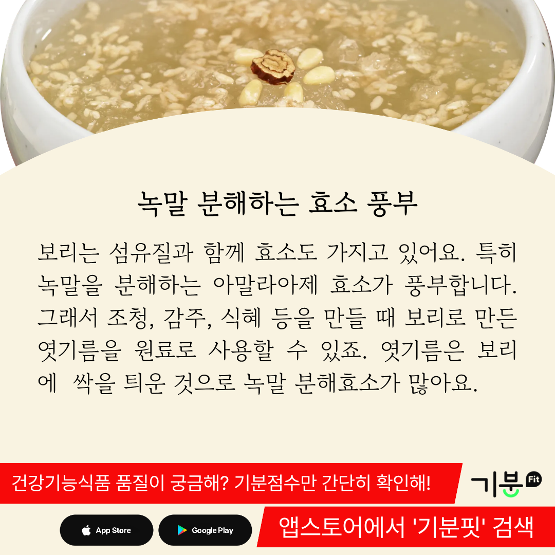 그 외에도 엿기름, 보리차, 보리누룩 등은 우리 식문화에 있어 빠질 수 없는 요소들이기도 하다.