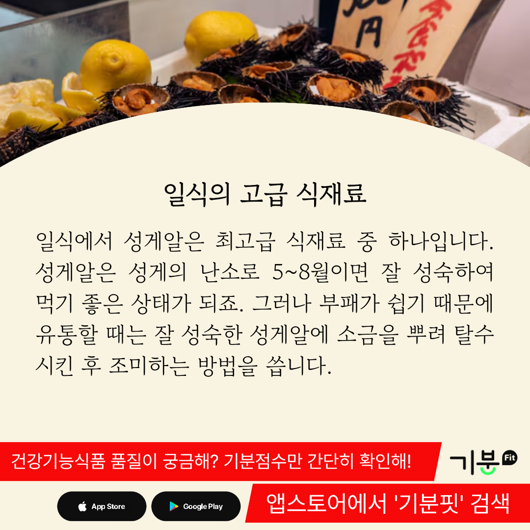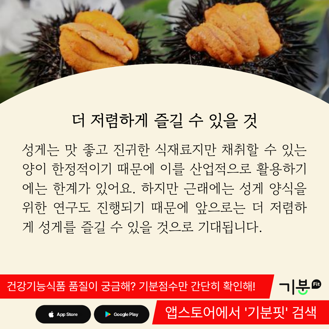 성게는 가공식품에 활용되는 자원으로서 측면보다는 풍미가 훌륭한 고급 식재료로서 사랑받고 있다.