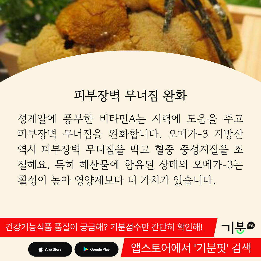성게알에 풍부한 비타민A는 시력에 도움을 주고 피부장벽 무너짐을 완화한다.
