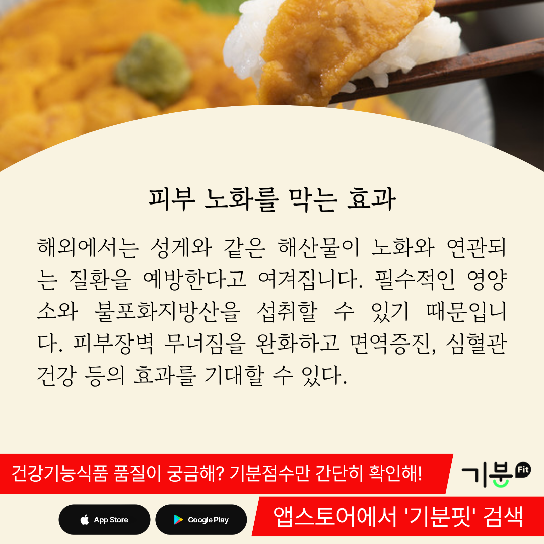실제로 성게와 같은 해산물을 충분히 섭취하면 필수적인 영양소와 불포화지방산을 섭취할 수 있어 노화가 완화되는 효과를 볼 수 있다.