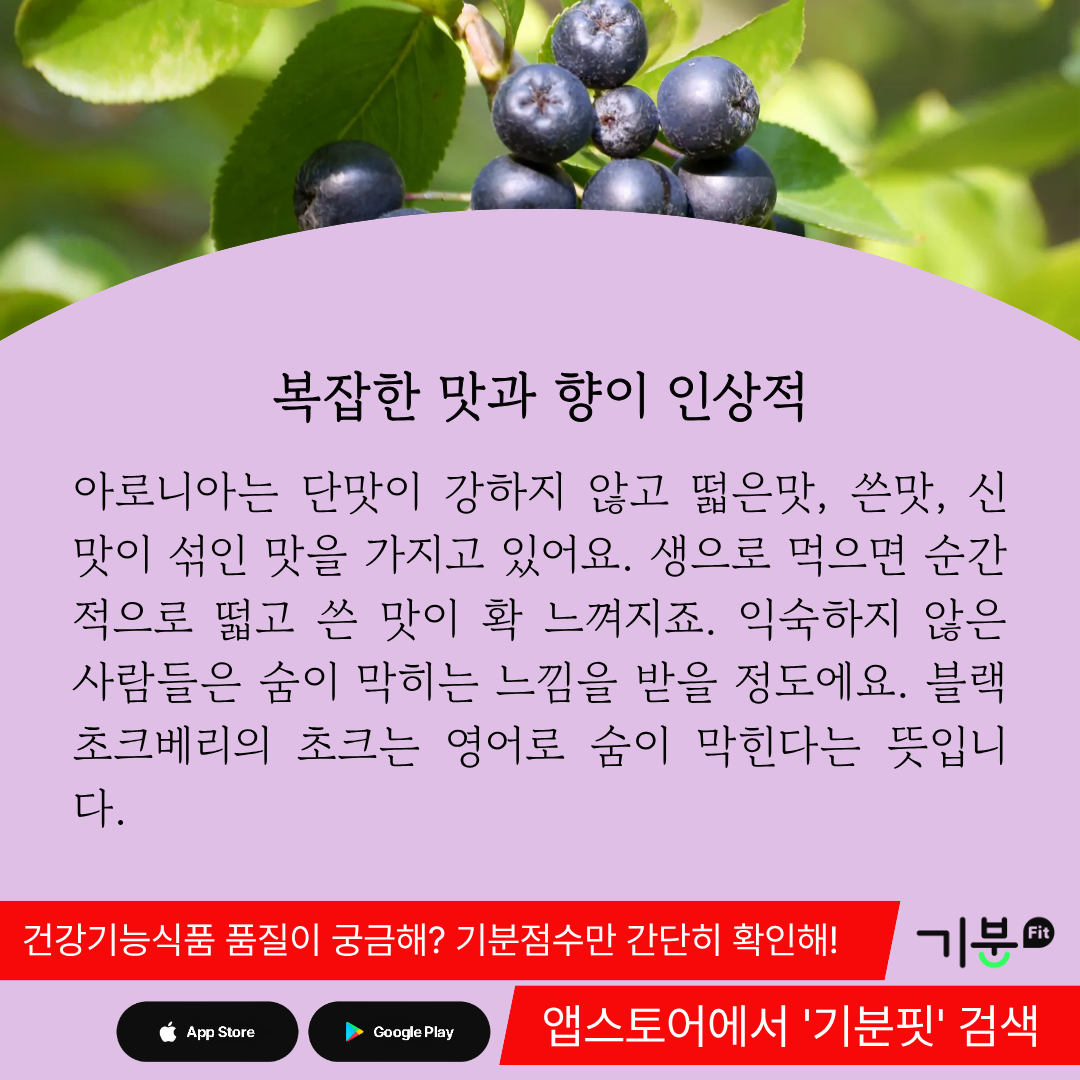 아로니아 열매를 날것으로 먹으면 순간적으로 떫고 쓴 맛이 확 느껴진다.