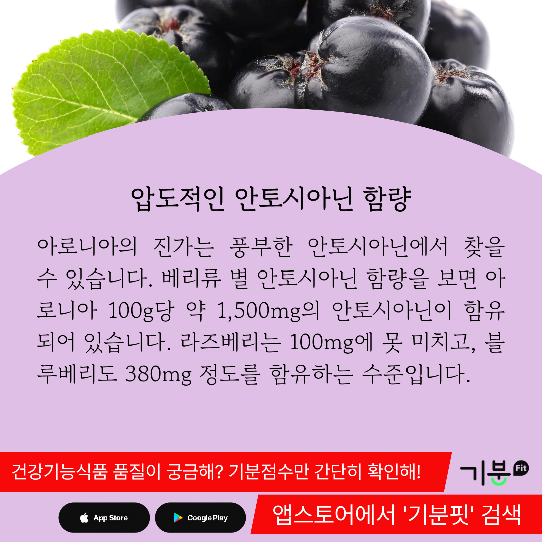 아로니아 100g당 1,500mg에 육박하는 안토시아닌이 함유되어 있다.