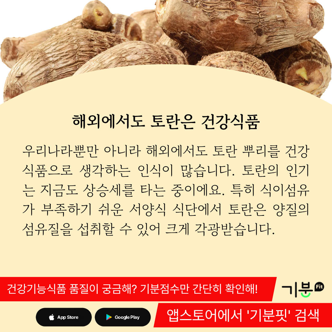 우리나라뿐만 아니라 최근에는 해외에서도 토란 뿌리를 건강식품으로 생각하는 인식이 많다.