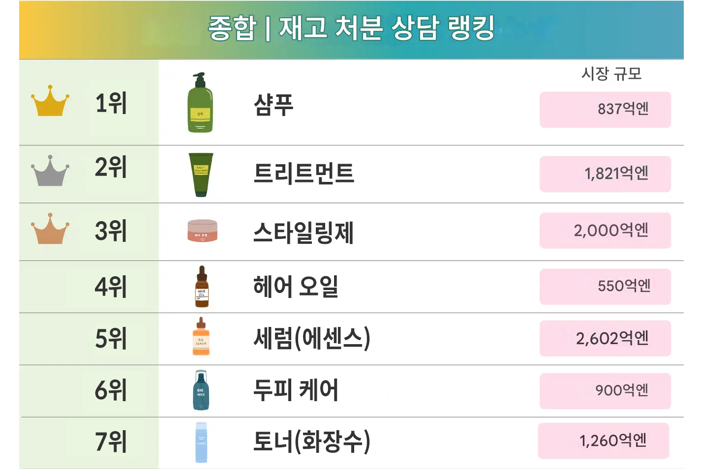 재고 처분 고민이 가장 깊은 카테고리는 헤어케어 분야였다. 종합 재고 처분 상담 순위에서 샴푸(1위), 트리트먼트(2위), 스타일링제(3위)가 나란히 상위권을 차지했다. 일본 내 물가 상승세와 맞물려 소비자들이 확실한 가치를 증명하지 못한 제품에는 더 이상 지갑을 열지 않는 심리가 반영된 결과다.