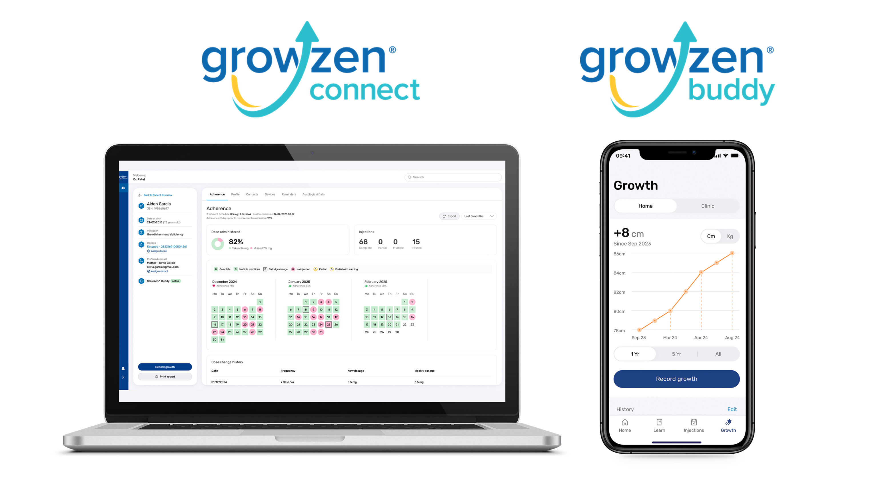 그로우젠 커넥트는 싸이젠 치료 환자의 성장호르몬 투약 데이터를 의료진이 원격으로 모니터링할 수 있도록 설계된 웹 기반 디지털 헬스케어 솔루션이다.3 스마트 전자동 투약 디바이스인 ‘이지포드(Easypod)’에서 기록되는 투약 데이터를 기반으로, 의료진이 치료 과정을 직관적으로 확인하고 치료 전략을 정밀하게 수립할 수 있도록 돕는다.
