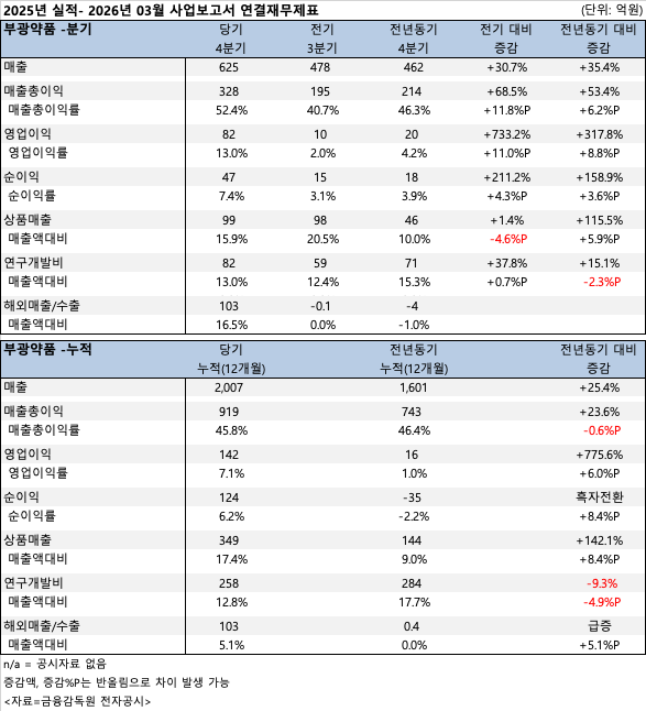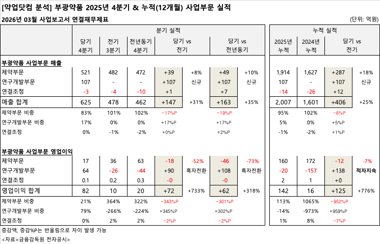 먼저 제약부문의 2025년 연간 매출은 1,914억 원으로 전년 대비 18%(287억 원) 증가하며 전사 외형 확장을 주도했다. 다만 영업·마케팅 비용 등의 증가로 제약부문의 연간 영업이익은 160억 원을 기록, 전년 대비 7% 소폭 감소했다. 4분기 단일 영업이익 역시 17억 원으로 줄어들며 수익성 방어라는 과제를 남겼다.