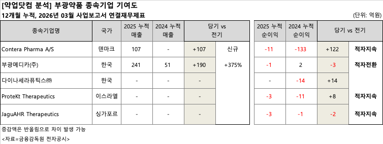 글로벌 R&D 부문의 성과는 더욱 드라마틱하다. 덴마크 소재 자회사 콘테라파마(Contera Pharma)는 4분기에만 107억 원의 대규모 신규 매출을 창출하며 R&D 부문의 흑자전환(4분기 영업이익 64억 원)을 이끌었다. 더불어 2024년 133.5억 원에 달하던 콘테라파마의 순손실 규모는 2025년 11억 원으로 대폭 축소(-122억 원)됐다. 과거 연결 실적을 갉아먹던 주된 요인이 완전히 해소된 셈이다.