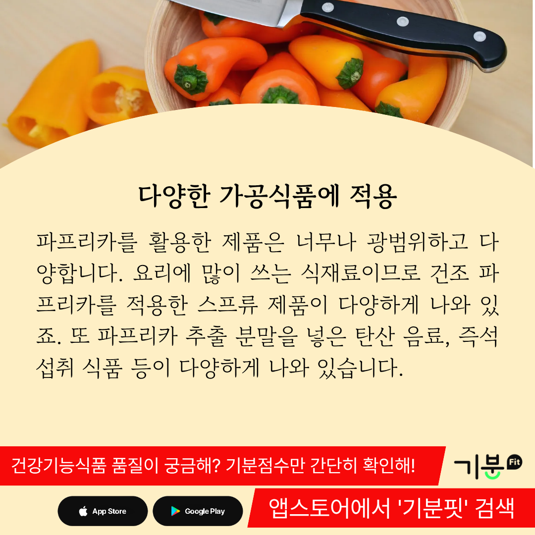 또 파프리카 추출 분말을 넣은 탄산 음료 제품, 파프리카 건조 분말을 적용한 즉석 섭취 식품 등이 다양하다.