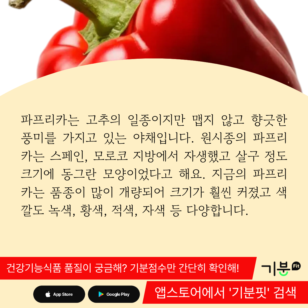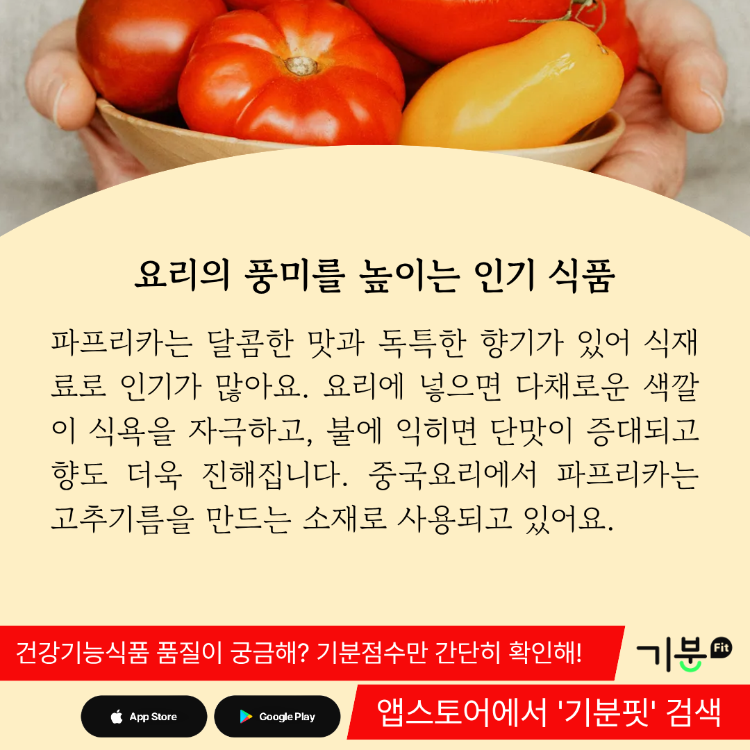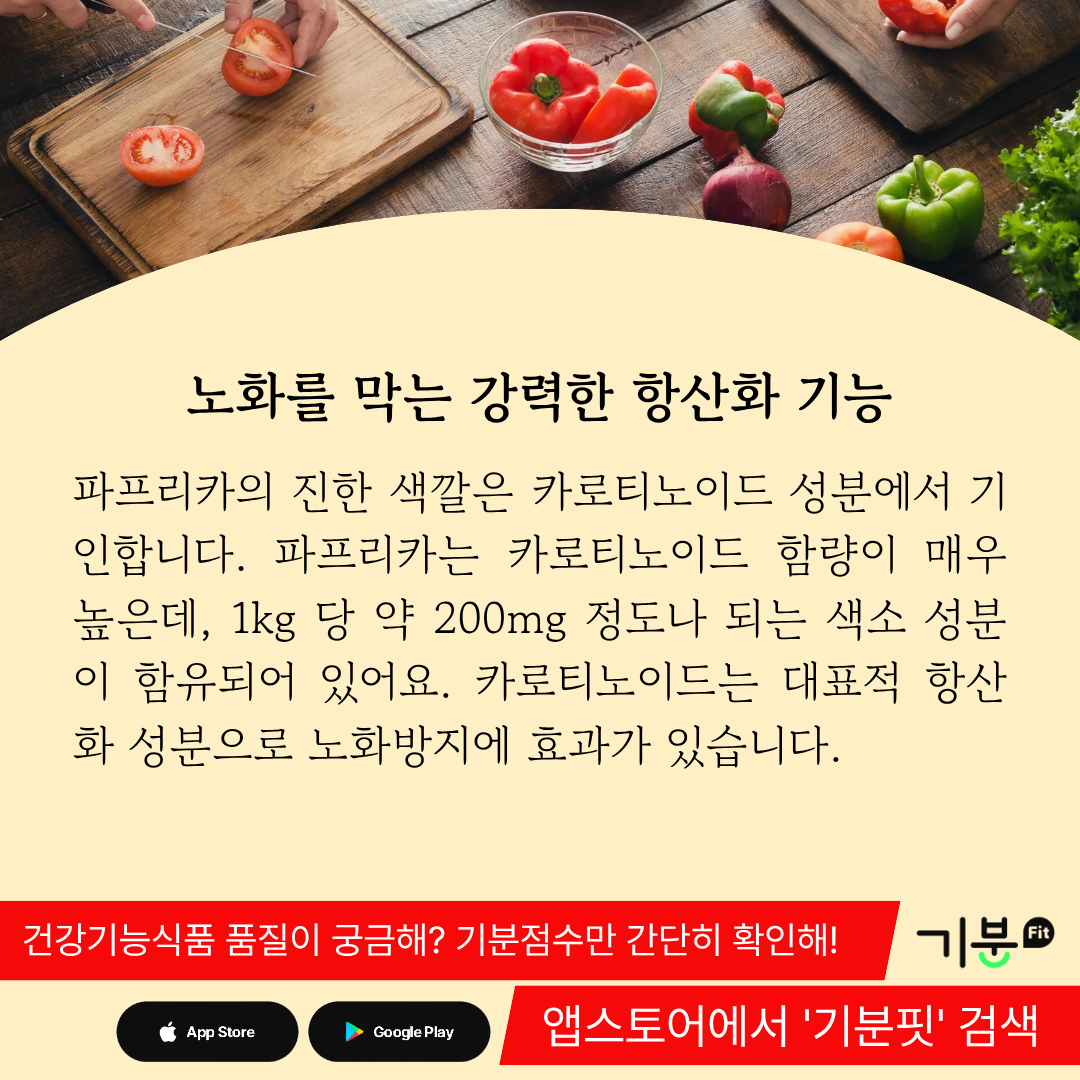 파프리카는 카로티노이드 함량이 매우 높은데, 1kg 당 약 200mg 정도나 되는 색소 성분이 함유되어 있다.