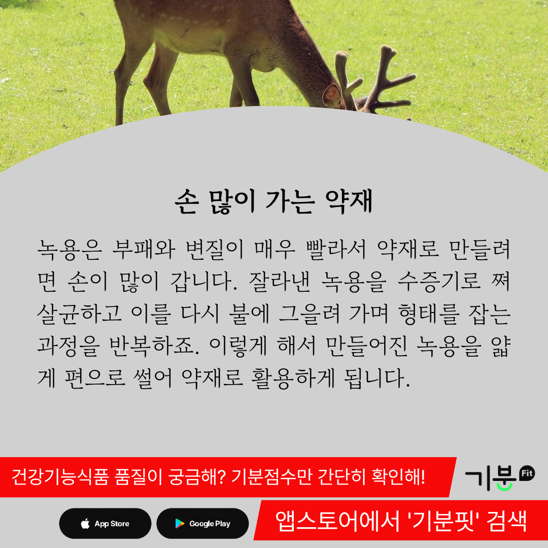 녹용은 부패와 변질이 매우 빨라서 이를 약재로 만들기 위해서는 손이 많이 간다.