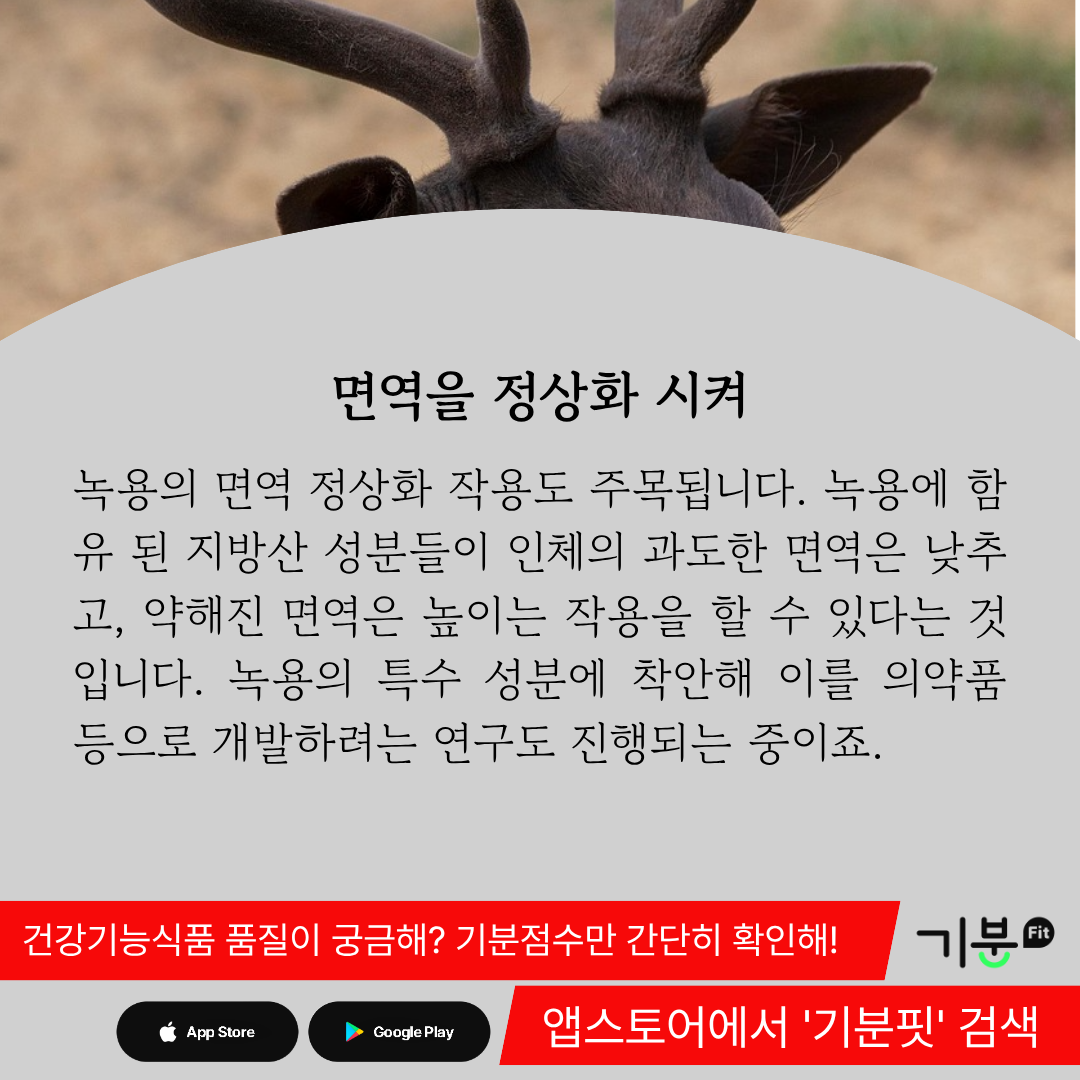 녹용에 함유 되어있는 지방산 성분들이 인체의 과도한 면역은 낮추고, 약해진 면역은 높이는 작용을 할 수 있다는 것이다.