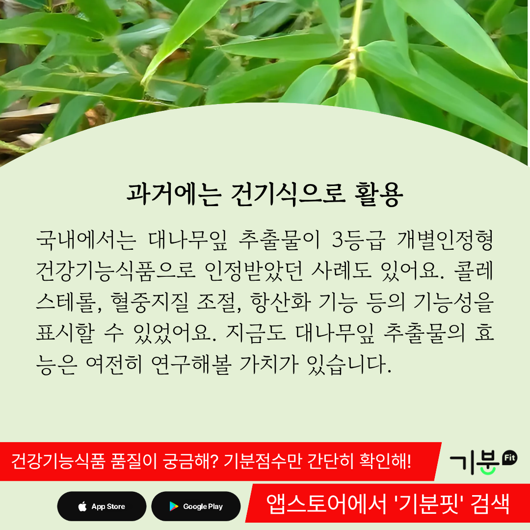 현재는 기능성 등급 3등급이 폐지되어 인정이 폐지된 상태지만 대나무잎 추출물의 효능은 여전히 연구해볼 가치가 있다.