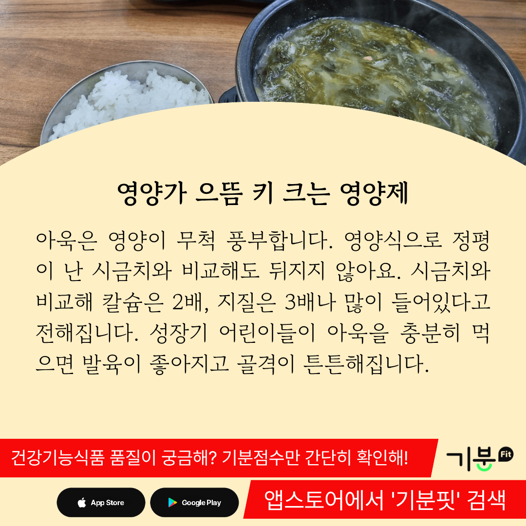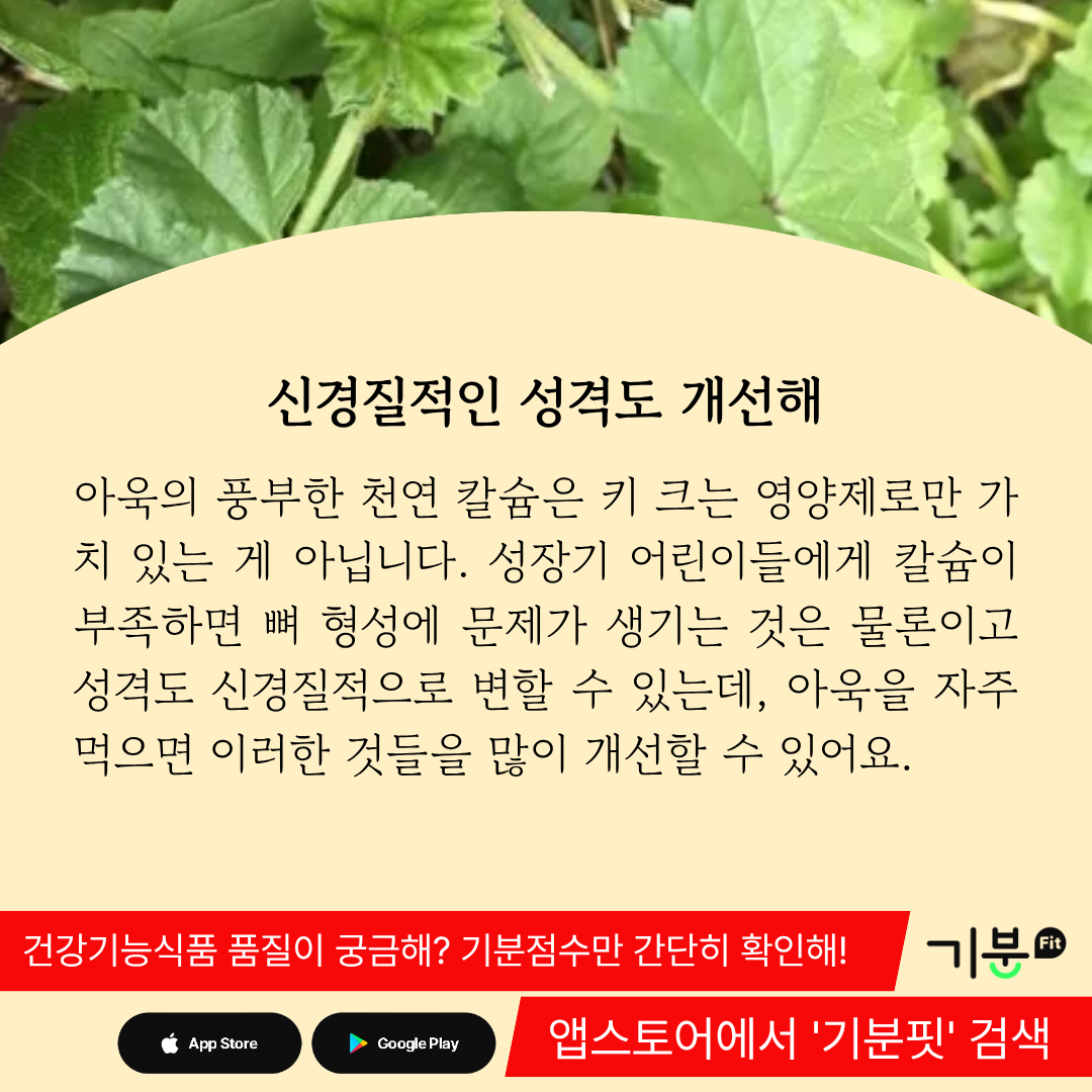 성장기 어린이들에게 칼슘이 부족하면 뼈 형성에 문제가 생기는 것은 물론이고 성격도 신경질적으로 변할 수 있는데, 아욱을 자주 먹으면 이러한 것들을 많이 개선할 수 있다.