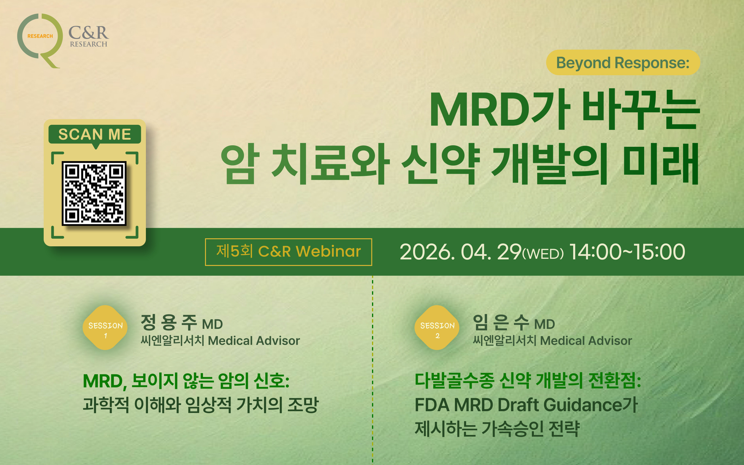 이에 씨엔알리서치는 사내 Medical Advisor가 참여하는 전문 강연을 통해 MRD의 과학적 의미와 글로벌 규제 환경 변화를 짚고, 실제 임상 개발 전략에 미치는 영향을 구조적으로 분석하는 자리를 마련했다.