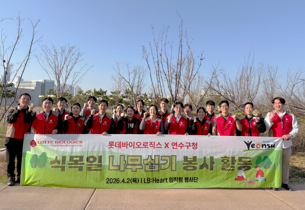 현장에는 연수구청 관계자와 지역 주민, 롯데바이오로직스 임직원 봉사단 ‘LB:Heart’ 등 약 400명이 참여했다. 참가자들은 연수구 첨단산업클러스터 근린공원 일대에 벚나무 250여 그루를 식재했다.