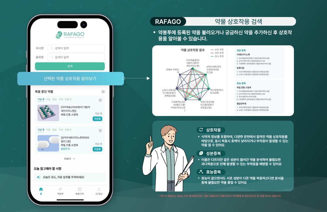 이지현 대표는 “라파고는 다제약물 복용 환자뿐 아니라 일반 사용자까지 포함해 누구나 복용 안전성을 사전에 확인할 수 있도록 설계된 서비스”라며 “문헌 기반 데이터를 통합 제공함으로써 합리적인 복용 의사결정을 지원할 것”이라고 밝혔다.