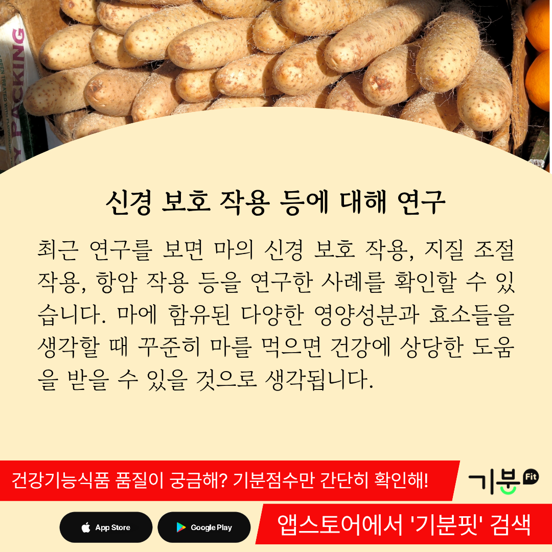 최근 연구를 보면 마의 신경 보호 작용, 지질 조절작용, 항암 작용 등을 연구한 사례를 확인할 수 있다.