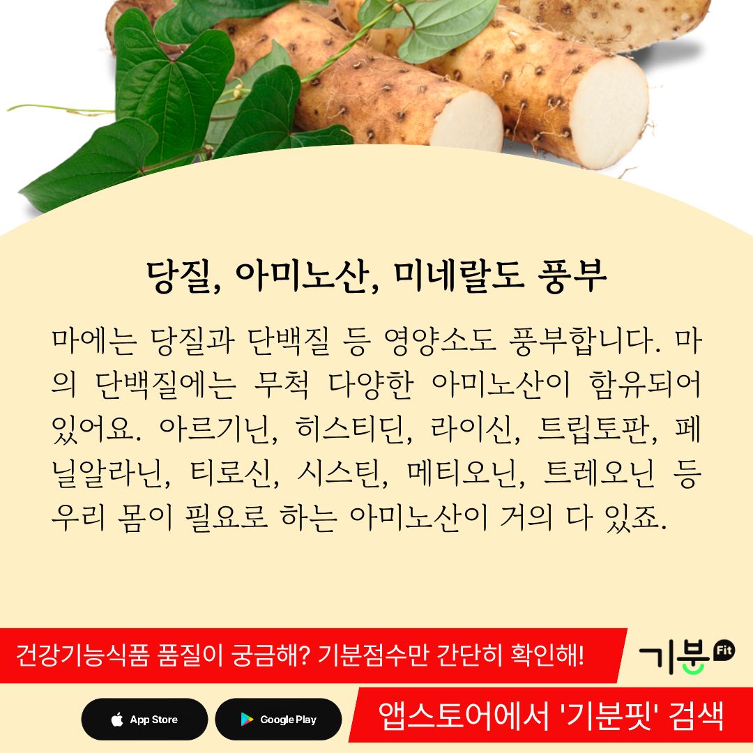 당질이 즉각적인 에너지를 주고, 아미노산 성분과 미네랄이 대사를 활성화하니 마를 먹게 되면 활력이 넘치는 기분이 생기는 것이다.