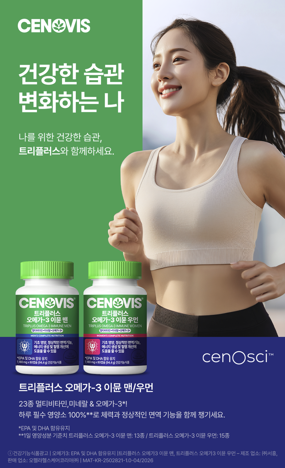 캠페인은 세노비스의 대표 제품인 ‘트리플러스’를 중심으로 전개된다. ‘트리플러스 오메가-3 면역 맨 & 우먼’은 현대인에게 필요한 23가지 영양소를 100% 함유한 멀티비타민·미네랄 제품으로, 기능성 성분과 함께 EPA 및 DHA를 포함한 오메가-3를 통해 체력 유지에 도움을 줄 수 있도록 설계됐다. 또한 아연이 포함되어 정상적인 면역 기능 유지에도 기여할 수 있다.