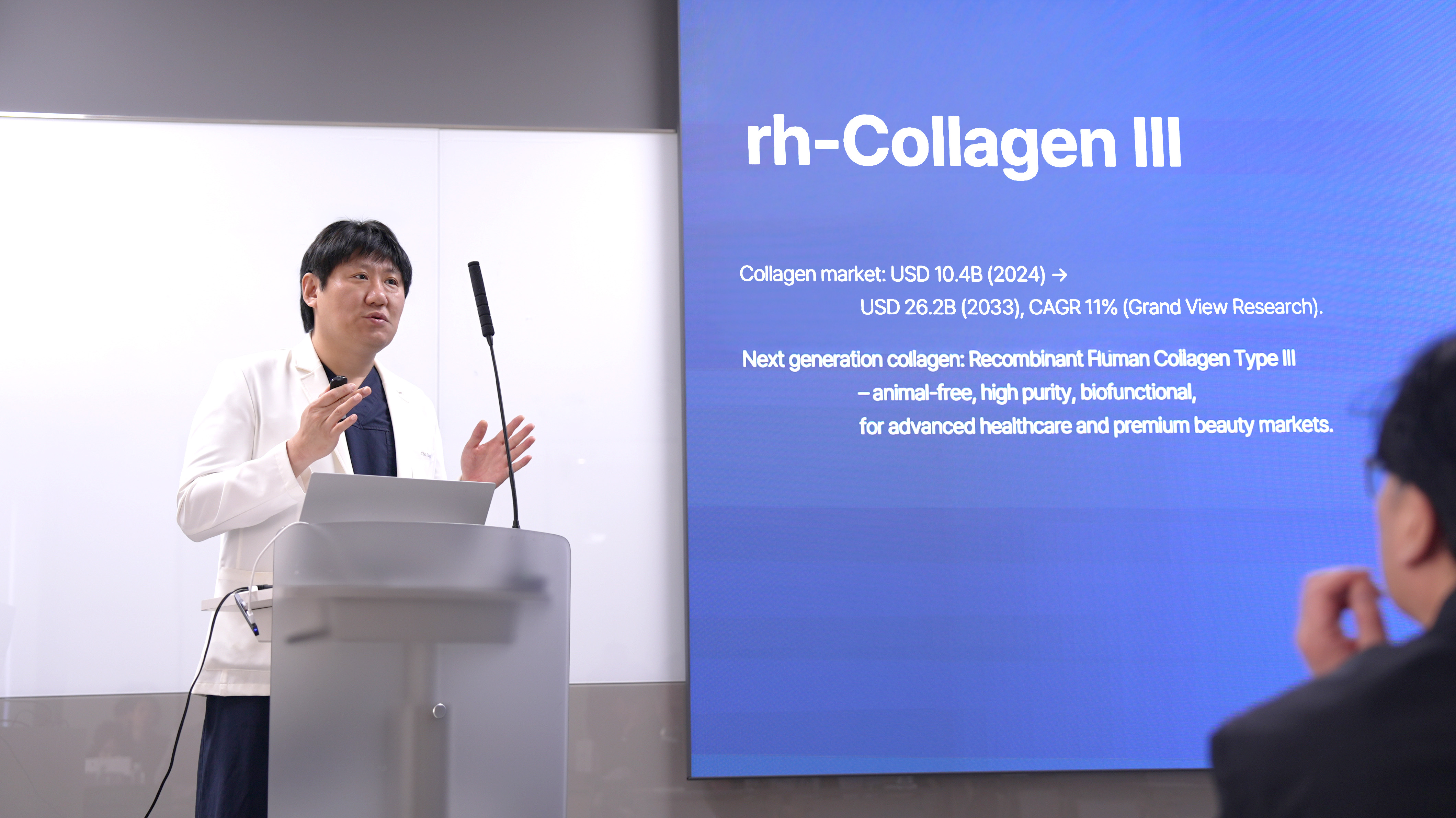 회사 측에 따르면 주력 제품인 ‘휴그로 엘라스틴 콜라겐’은 동물 유래나 사체(카데바) 유래 소재가 아닌, 유전자재조합 기술로 구현된 100% 인간 콜라겐(Type III)이다. 인체 콜라겐과 동일한 ‘삼중 나선(Triple Helix)’ 구조를 완벽하게 재현해 생체 적합성이 높고 구조적 안정성이 뛰어난 것이 특징이다.
