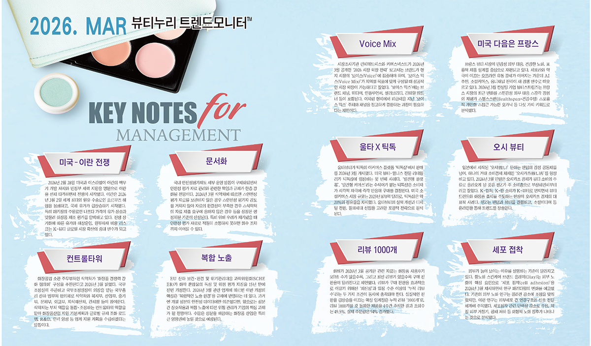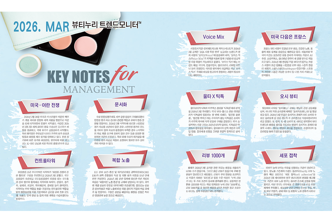 2026년 2월 28일 미국과 이스라엘이 이란의 핵무기 개발 저지와 반정부 세력 지원을 명분으로 이란을 선제 타격하면서 전쟁이 시작됐다. 이란은 2026년 3월 2일 세계 최대의 원유 수송로인 호르무즈 해협을 봉쇄하고, 국제 유가가 급상승하기 시작했다. 특히 패키징의 주원료인 나프타 가격이 유가 상승과 맞물려 화장품 제조 원가를 압박하고 있다. 전쟁 장기화에 따른 유가와 해상운임, 원부자재 비용 리스크는 K-뷰티 글로벌 시장 확산의 중대 변수가 되고 있다.