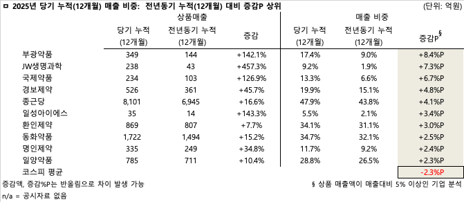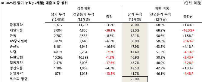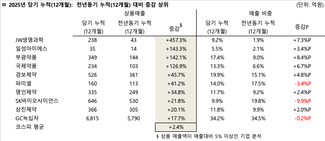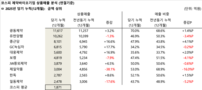 이 같은 상품매출의 성장은 광동제약, 유한양행, 종근당 등 탄탄한 영업망을 갖춘 대형 제약사들이 블록버스터 도입 품목의 시장 지배력을 유지한 결과로 풀이된다. 코스닥 시장 역시 HK이노엔, 동국제약 등 주력 제약사들이 강력한 파트너십을 기반으로 유통망을 확장하며, 자체 신약 개발을 위한 캐시카우 확보에 주력하고 있음을 입증했다.
