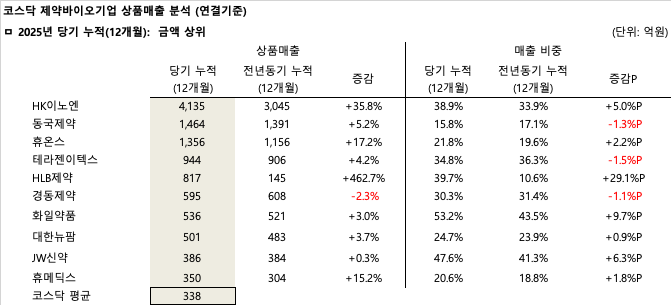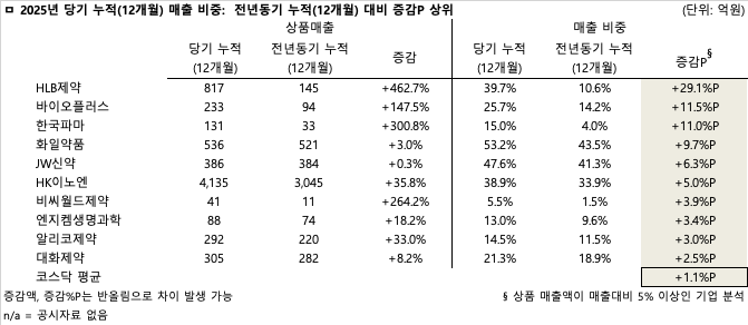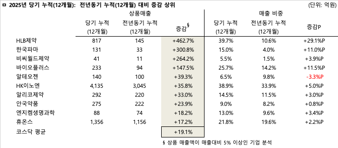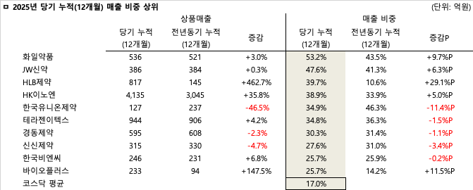 코스닥 제약·바이오 45개사의 경우 2025년 누적 평균 상품매출이 전년 동기 대비 19.1% 증가한 338억원(매출 비중 17.0%)을 기록했다.