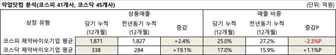 코스피 시장은 전통 제약사들을 중심으로 안정적인 다국적 제약사 품목 도입을 통해 견조한 외형을 유지했으며, 코스닥 시장은 전년 대비 두 자릿수의 높은 성장세를 기록하며 상품매출을 통한 폭발적인 양적 성장세를 보여주었다.