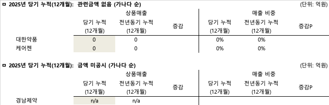 코스닥 상장사 중 2025년 당기 누적 상품매출 관련 금액이 없는 기업은 대한약품, 케어젠 등 2개사로 확인됐다. 아울러 경남제약은 관련 금액을 별도로 공시하지 않았다.