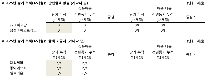 코스피 상장사 중 2025년 당기 누적 상품매출 관련 금액이 없는 기업은 삼성바이오로직스, SK바이오팜 등 2개사로 나타났다. 한편, 대원제약, 동아에스티, 셀트리온 등 3개사는 상품매출 금액을 별도로 공시하지 않았다.