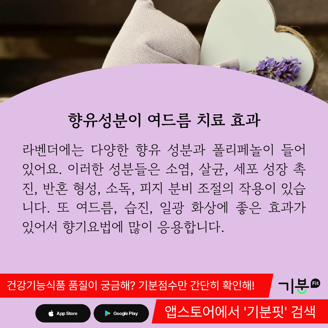 라벤더는 소염, 살균, 세포 성장 촉진, 반혼 형성, 소독, 피지 분비 조절의 작용이 있다.