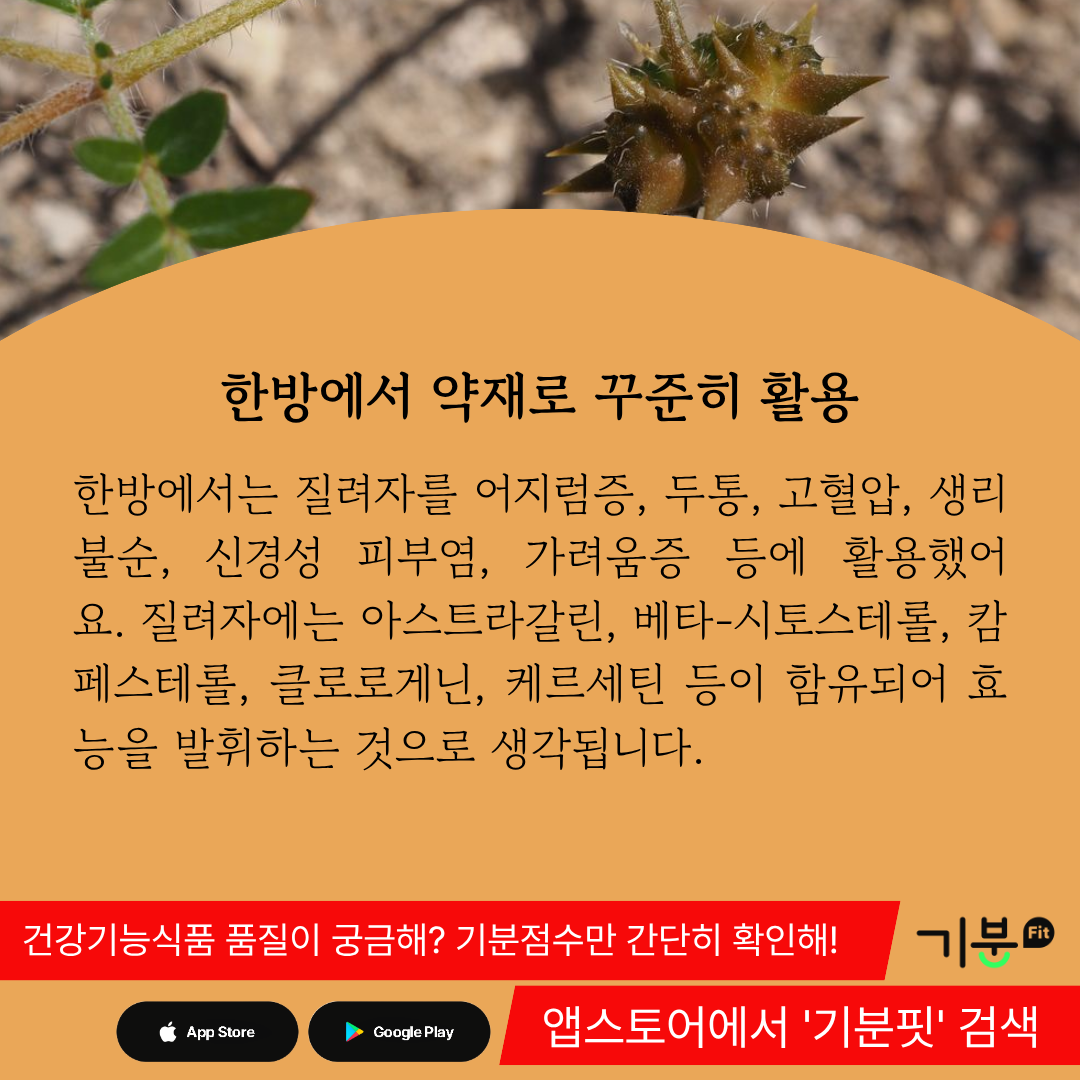 한방에서는 질려자를 어지럼증, 두통, 고혈압, 생리불순, 신경성 피부염, 가려움증 등에 활용했다.