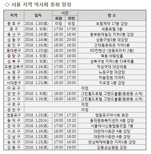 28일 현재 집계된 서울 지역 약사회 정기총회는 2016년 1월 9일 4개 지역 약사회가 정기총회를 개최하는 것을 비롯해 30일 종로구약사회를 마지막으로 마무리될 예정이다.