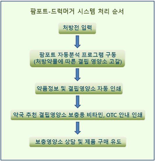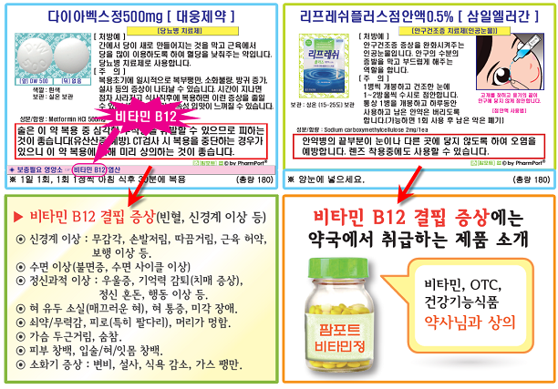 예를 들어 당뇨로 인해 메트폴민 성분의 약을 처방받은 환자에게는 비타민B12 결핍 시 나타날 수 있는 빈혈 및 신경계이상 등에 대한 안내문이 자동으로 인쇄되고, 이와 함께 비타민B12 고함량 제품이 자동으로 소개되어 복약안내문을 받아본 환자가 약사에게 먼저 해당 제품의 상담을 요청하는 효과를 기대할 수 있다.