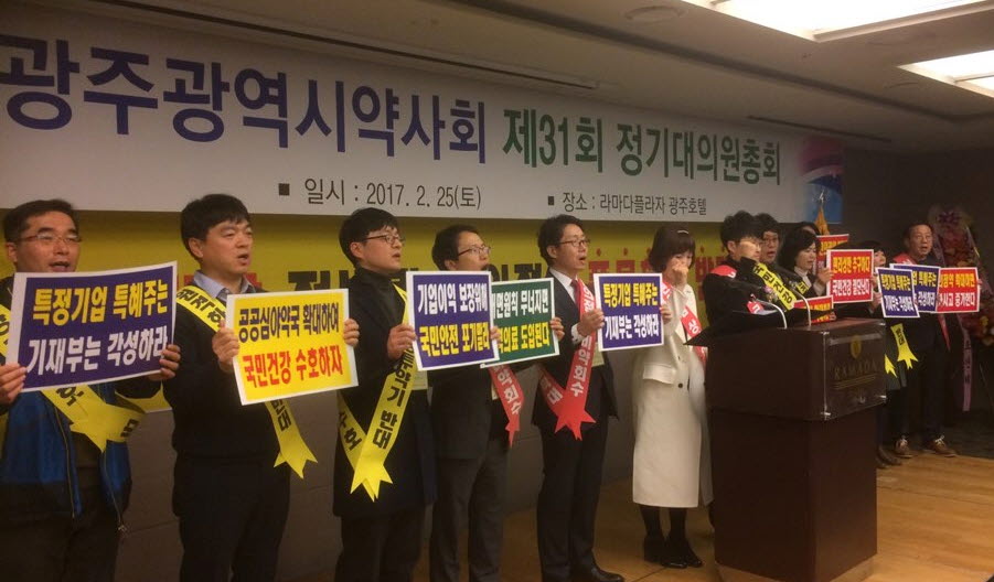 특히 광주시약사회는 "소수자본의 이익을 위해 국민의 생명을 위협하는 정부의 상비약 품목 확대를 절대적으로 반대하며 현품목들의 안전한 관리체계를 구축할 것을 촉구한다"며 "약사들은 국민의 안전과 생명을 지키기 위해 공공심야약국, 의원약국 당번제도와 같은 공공의료가 정착될 수 있도록 각고의 노력을 기울이겠다"고 천명했다.