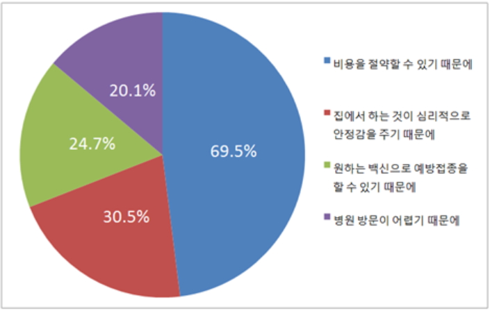 가정 접종의 이유는 비용절감(69.5%)과 동물병원 방문의 어려움(20.1%)으로 꼽혔다.