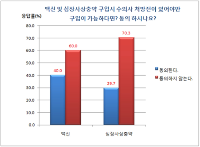 반려동물 보호자가 예방접종 백신, 심장사상충약, 구충제 등을 구입하기 위해 수의사의 처방전을 받아야만 구입이 가능하도록 한다면 동의 하는지에 대한 답변으로 약70% 의 보호자는 '동의하지 않는다'고 응답했다.